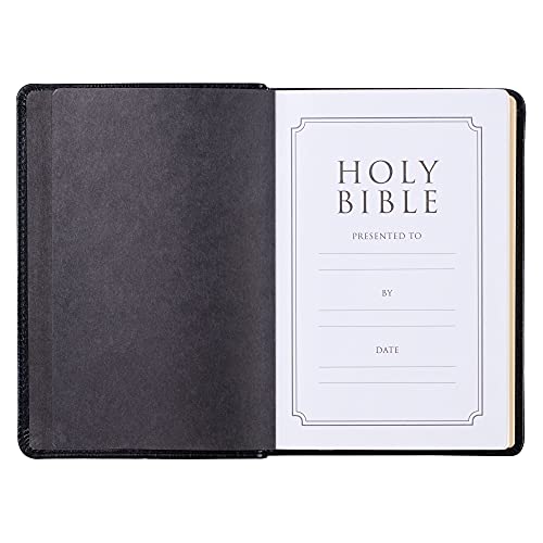 The Black Full Grain Leather Compact King James Version Bible is an excellent gift for Christmas, First Communion, Baptism, or for any other significant event in a person’s life. There is a presentation page in the front of the Bible where a personal note may be written. Black Full Grain Leather Large Print Compact King James Version Bible is packaged in a sturdy gift box that prevents damage and is easy to wrap.