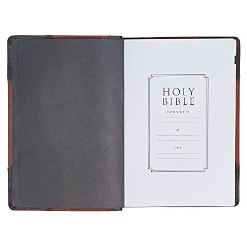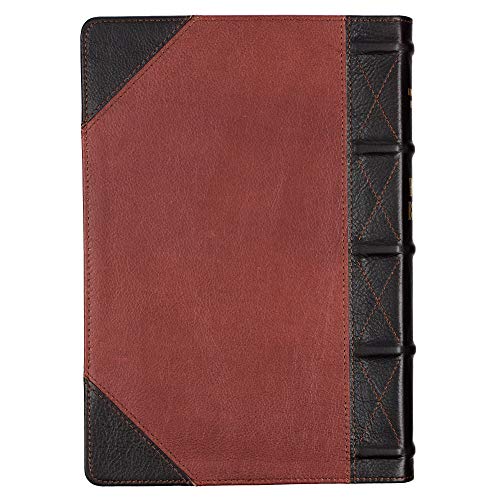 The two-toned full grain leather cover in rich tawny and brown tones is designed in a traditional portfolio look with topstitched accents and portfolio corners. Gilt-edged pages further complement the design, quality, and style. The detailed craftsmanship of the topstitching on the cover increases the durability of the leather and adds a subtle element of style to the Bible's overall look. The spine features a heat debossed title and gold foiled decorative spine ribbing.
