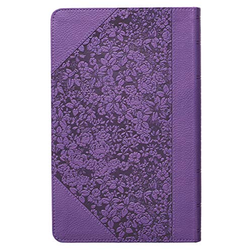 The spine and cover corners are wrapped in a vibrant texturized purple faux leather and topstitched with a double row of stitches for durability. The front and back covers are covered in an elaborate heat debossed floral design. The spine features heat debossed decorative spine ribbing with a heat debossed title and the KJV imprint.