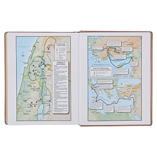With plenty of space to doodle, list, or write, the 2-inch wide margins will keep your insights close to the text you are studying. Additional study helps are also available in this Bible and include two satin ribbon markers, a thematic Scripture verse finder, a concordance, a one-year Bible reading plan, and 8 full-color maps. The text is presented in a large 10.8 point type to enhance readability.