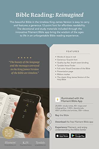 The new Tyndale KJV Personal Size Giant Print Bible, Filament-Enabled Edition has readable text and an attractive layout in an easy-to-carry size. And while it has the same low price as basic text-only Bibles, the KJV Personal Size Giant Print Bible offers much more. It not only features a bold new design and the trusted and revered King James Version (KJV) but also includes the groundbreaking Filament Bible app. This app enables you to use your mobile phone or tablet to connect every page to a vast array of related content, including study notes, devotionals, interactive maps, informative videos, and worship music.