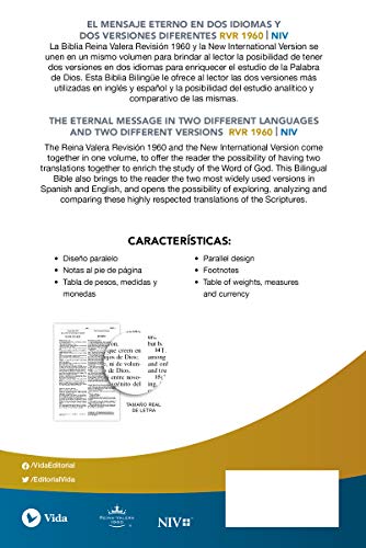 The Spanish Reina Valera 1960 Revision and the English New International Version are for the first time in history united in one single volume, giving the reader an opportunity of having two translations in two languages for a richer study of the Word of God.