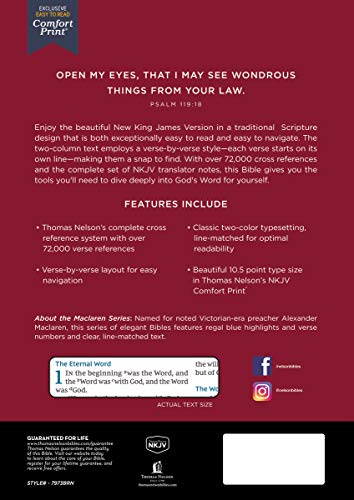 Enjoy the beautiful New King James Version in a traditional Scripture design optimized to help you quickly navigate through the Bible. The 2-column text employs a verse-by-verse—or verse-style—setting, which means that each verse starts on its own line, making them a snap to find. The large print text is easy to read, and the blue headings and verse numbers stand out while providing a restful, thoroughly enjoyable Scripture-reading experience. With over 72,000 cross references and the complete set of NKJV translator notes, this Bible gives you the tools you'll need to dive deeply into God's Word for yourself.
