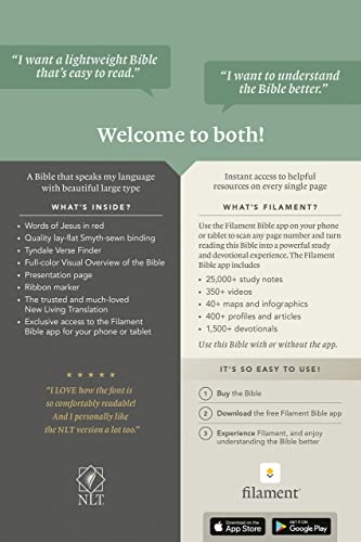 NLT Wide Margin Bible, Filament-Enabled Edition is the only journaling Bible with access to the Filament Bible app, which features thousands of study notes, devotionals, videos, reading plans, and more!