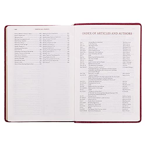 An introduction by managing editor Martin Manser and associate editor Mike Beaumont leads into the features of the Bible and an introduction to the New Living Translation. In addition to the NLT text, you will find informative sidebar articles, full-page articles on key aspects of Spiritual growth and fundamental theological truths, book introductions, character profiles of men and women of the Bible, topical ties to connect articles with relevant Scripture, and cross-references. There is also a topical index at the back of the Bible and an index of articles and authors for easy reference.