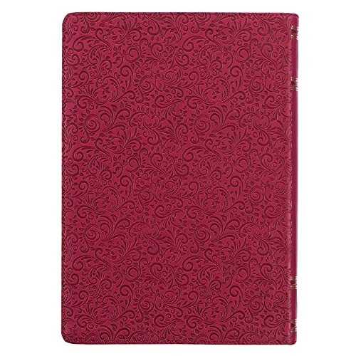 The front and back covers of the berry-colored faux leather Bible are heat-debossed with a swirly fern design. A smooth faux leather patch that carries the gold foiled title is appliquéd on the front cover.