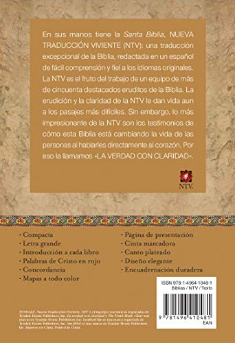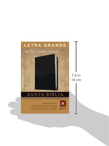 La Edición compacta letra grande NTV ofrece una experiencia cómoda de lectura para aquellos que prefieren una Biblia de texto grande, o para quienes simplemente quieren reducir el cansancio de la vista. Su tamaño de letra y su encuadernación compacta hacen que esta Biblia sea fácil de leer y de llevar consigo adondequiera. Sus características de lujo incluyen una página de presentación, una concordancia, palabras de Cristo en rojo, introducción a cada libro, mapas a todo color, una cinta marcadora y canto plateado. El tamaño de letra es de 8.75 puntos.