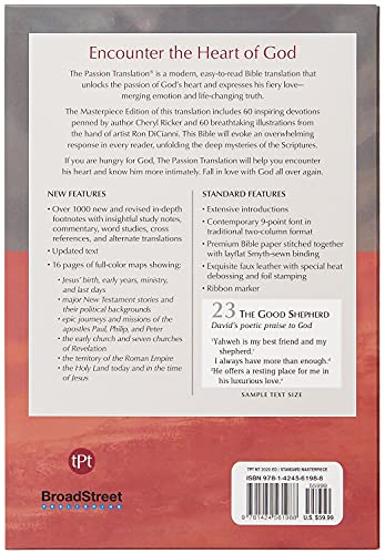 The Masterpiece Edition of this translation includes 60 inspiring devotions penned by author Cheryl Ricker and 60 breathtaking illustrations from the hand of artist Ron DiCianni. This Bible will evoke an overwhelming response in every reader, unfolding the deep mysteries of the Scriptures.