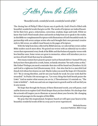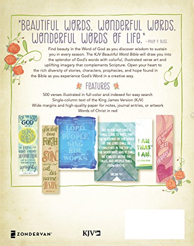 Be drawn into God’s Word through a fresh, creative expression of the beautiful words of God. Crafted on high-quality paper and balanced with inspiring full-color art and blank space, the KJV Beautiful WordTM Bible will encourage a deeper and more authentic quiet time. With 500 verses illustrated to help you see the rich diversity of stories, characters, prophecies, rewards, and hope contained within Scripture, you will discover wisdom to sustain you in every season, drawing you deeper into God’s life-changing and inspired Word.