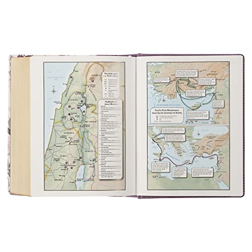The title and the KJV reference also appear in gold foil on the spine. The note-taking Bible features uniquely wide side margins that are lined. This space is perfect for making notes while you study God's Word. For added convenience, two satin ribbon markers are included to mark multiple pages. The interior is printed in a single color. A thematic Scripture verse finder will help you locate verses based on a theme, and a concordance will help you find the location of words in the Bible. A one-year Bible reading plan will keep your personal studies on track. 8 full-color maps will help you navigate the ancient world and provide a visual of the history of the Bible, and the Epistle Dedicatory letter is added to the front of the Bible to remind you of the KJV history.