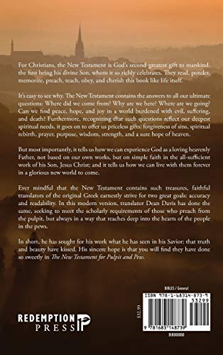 Ever mindful that the New Testament contains such treasures, faithful translators of the original Greek earnestly strive for two great goals: accuracy and readability. In this modern version, translator Dean Davis has done the same, seeking to meet the scholarly requirements of those who preach from the pulpit, but always in a way that reaches deep into the hearts of the people in the pews.