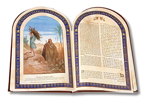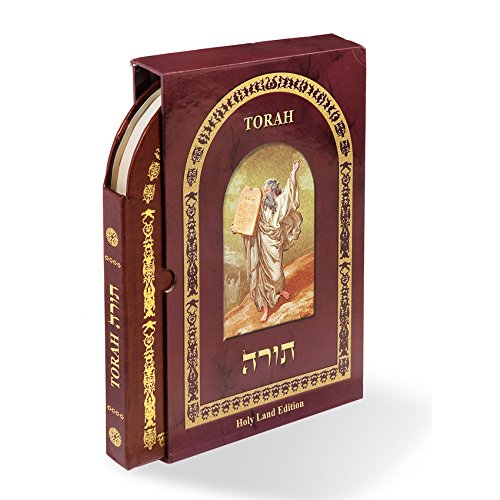 Holy Land edition of the complete Torah (the first five books of the Bible), beautifully rendered with color engravings and illuminated calligraphy detail.The original Hebrew text is side by side with the English translation, so that both may be read at the same time without turning the page.Encased in an elegant cover featuring symbolic medallion insets and gold foil stamping; bordered with debossed, elegant border on both front and back. 13.5" x 9" x 1"; 324 pages; bonded leather cover; a unique work of art for home or place of worship.